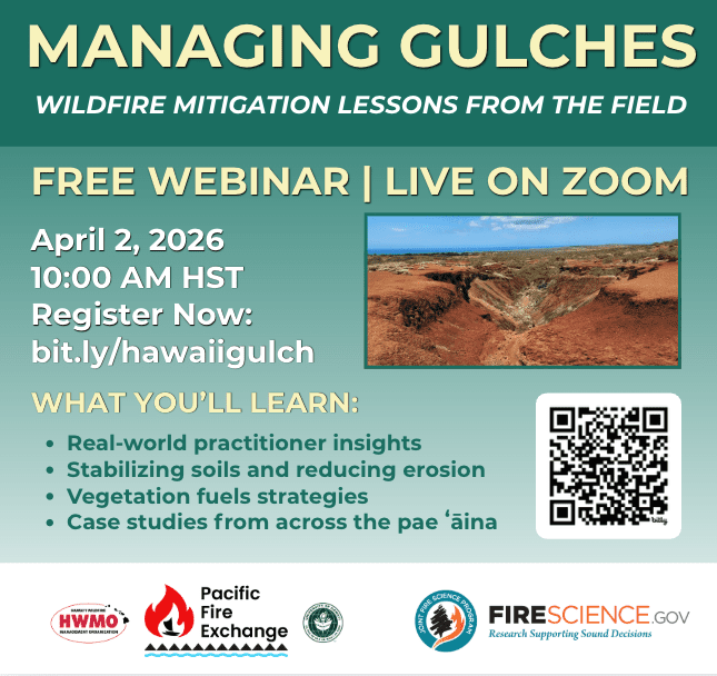 Join the Pacific Fire Exchange program (PFX) for a webinar launching new resources that share practical lessons from Hawaiʻi land managers working to reduce wildfire risk in and around gulches…